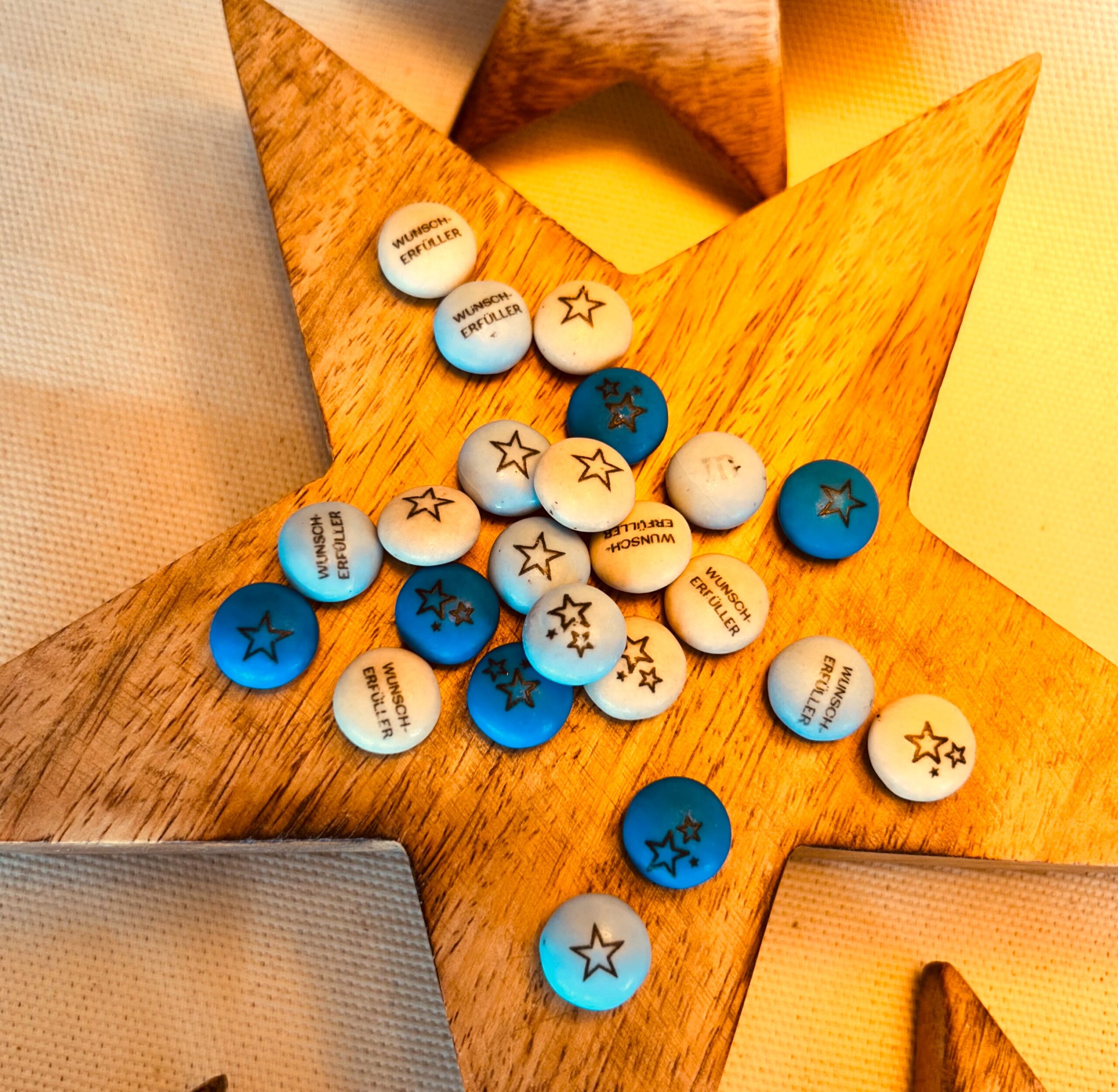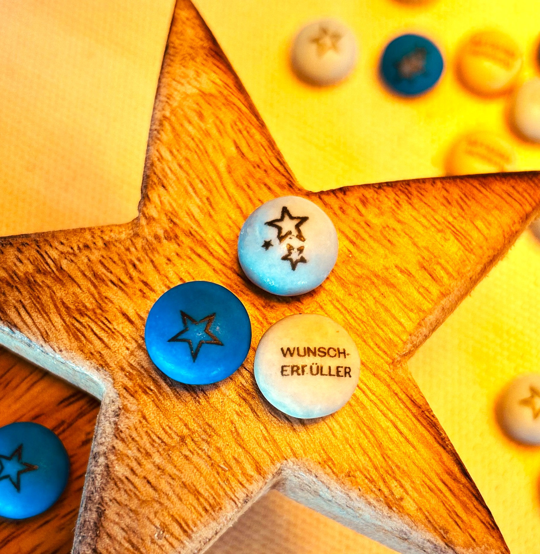 Inhalt: Ein Gläschen (3 x 6 cm) mit 24 Schokoladenperlen; einseitig mit einem Stern oder Text bedruckt.