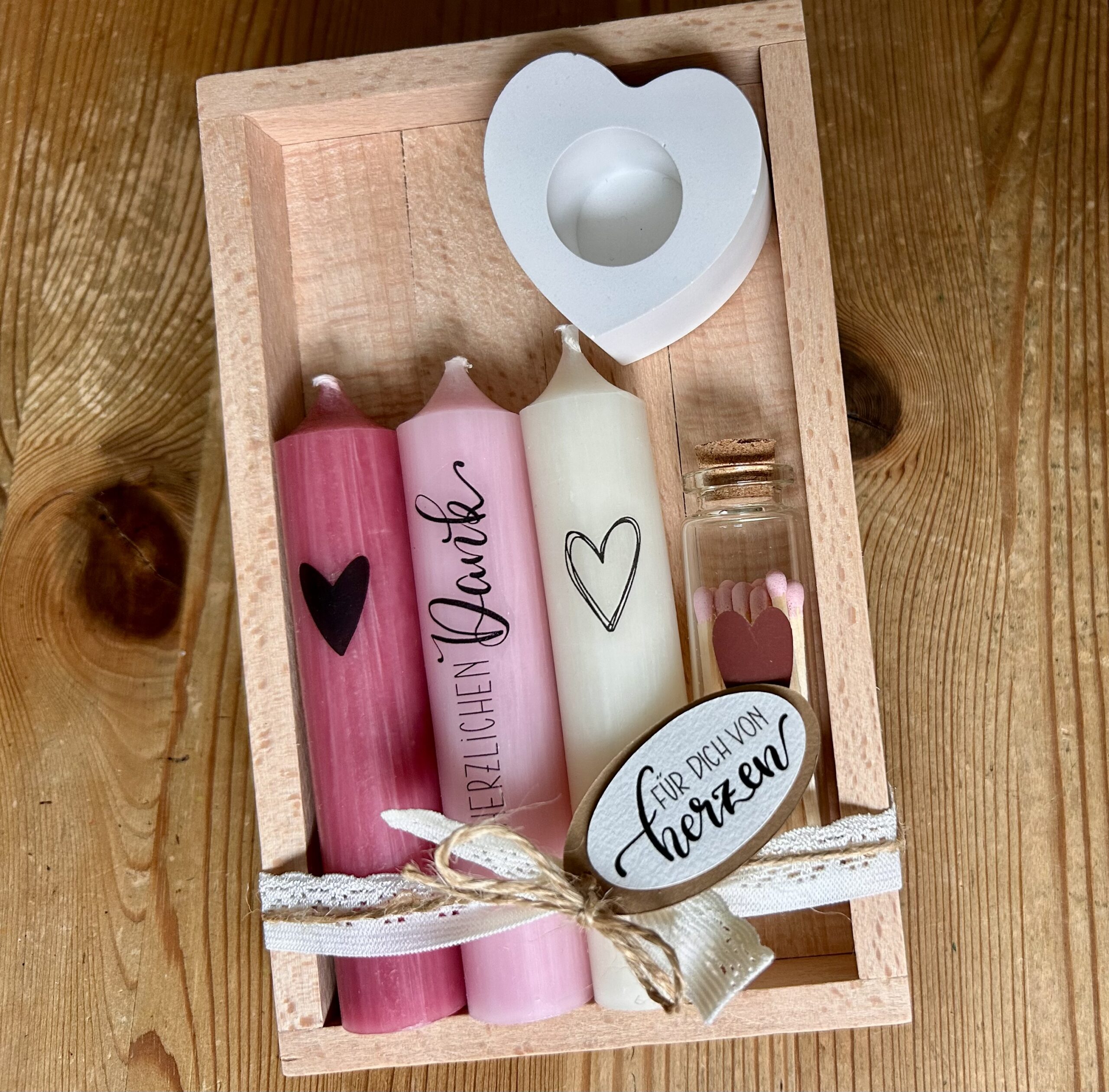1 Kerzenständer mit Beschriftung aus Raysin, 4 Kerzen mit einer Botschaft, wenn sie nach 6-8 Stunden runtergebrannt ist, ein Zundholz-Gläsli mit einem Stern, woran die Zundhölzer angezündet werden,