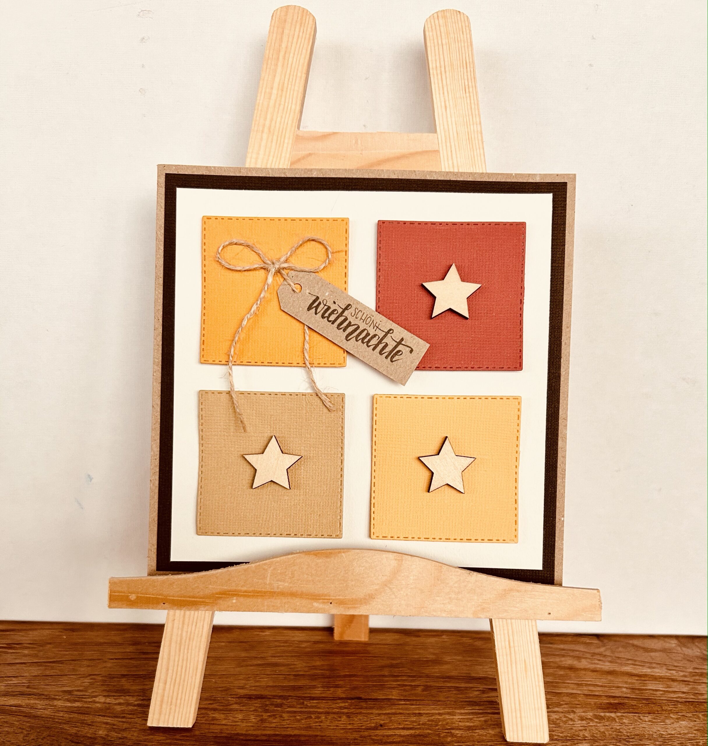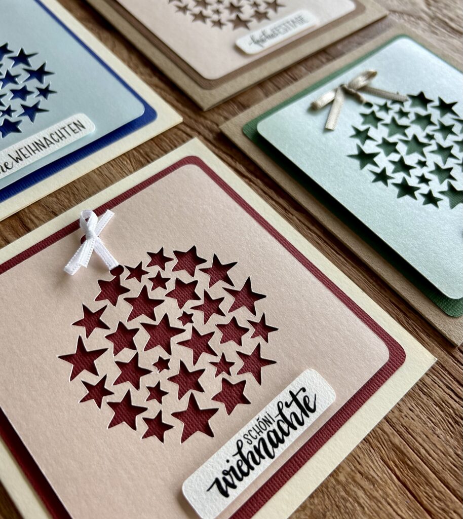 Perlglanzpapier auf dunkelrotem Strukturpapier mit heller Karte (erste 3 Bilder); auf braunem Strukturpapier mit Kraftpapier-Karte (untere 3 Bilder).